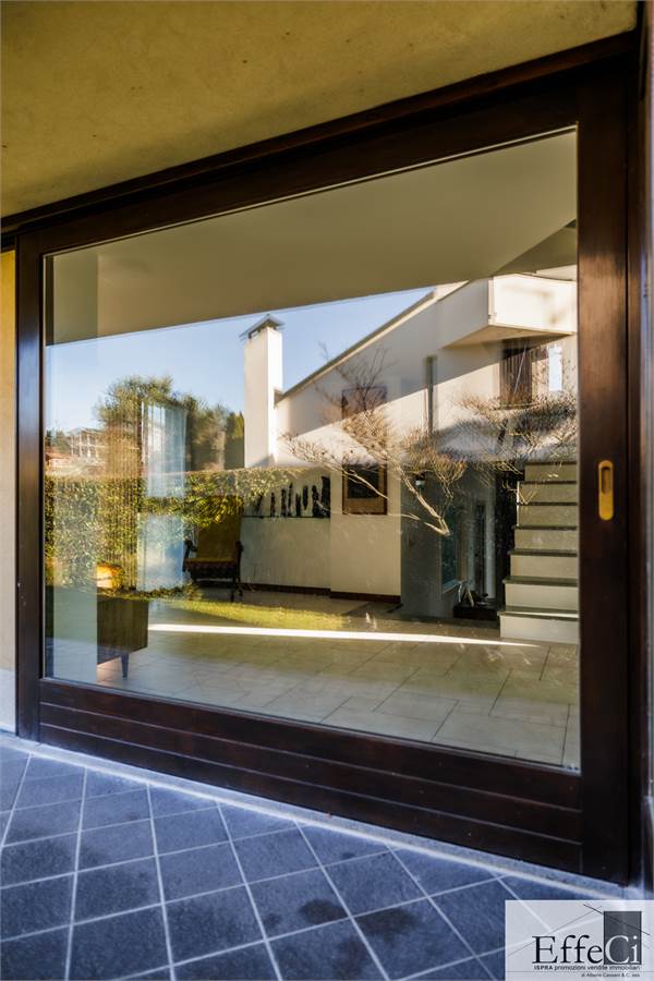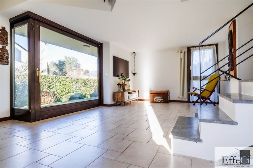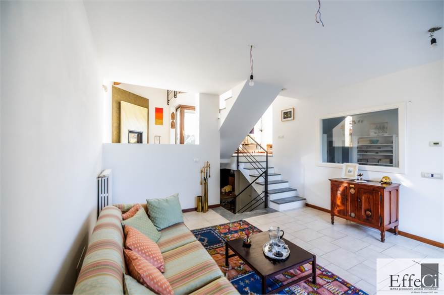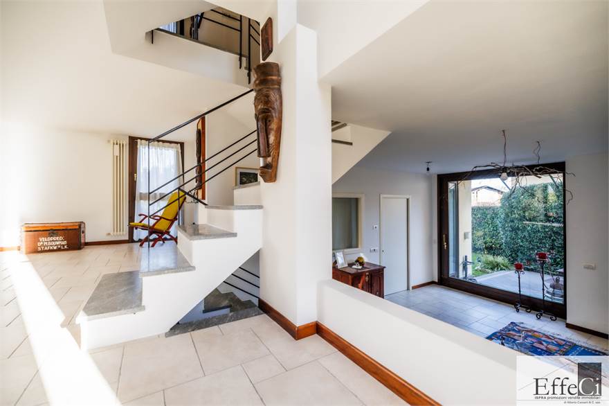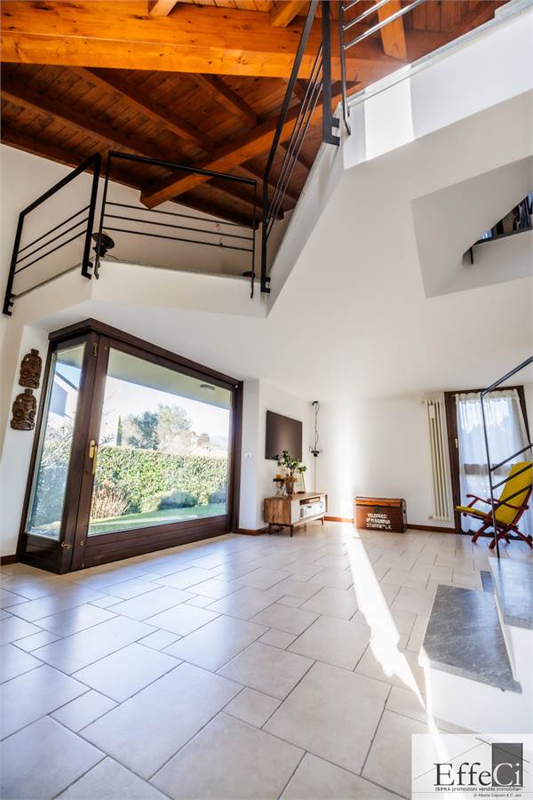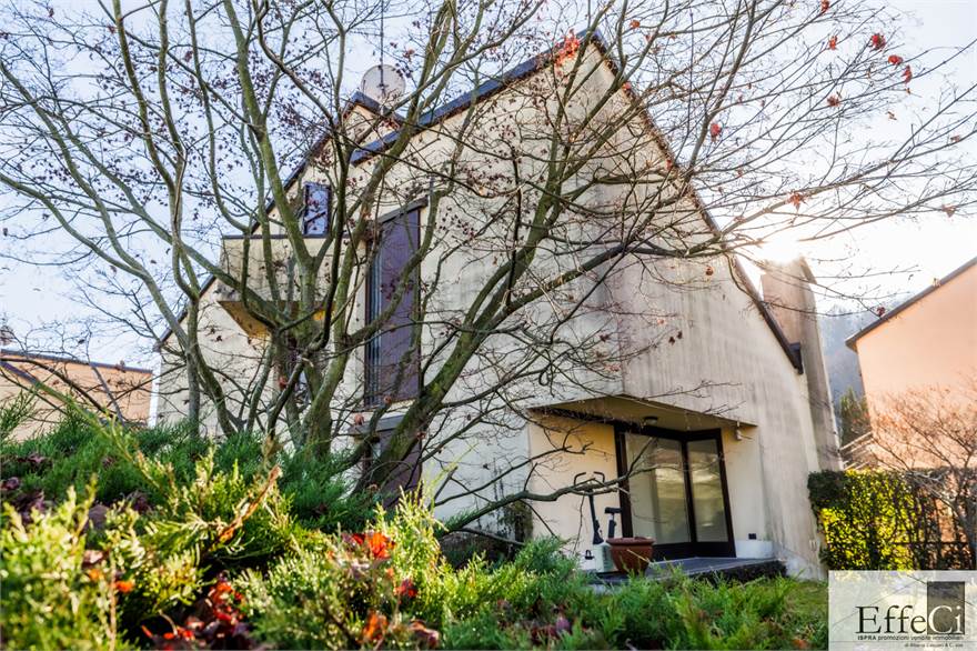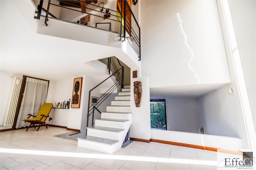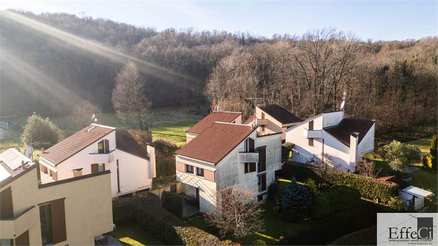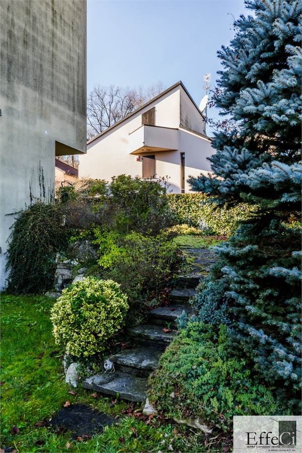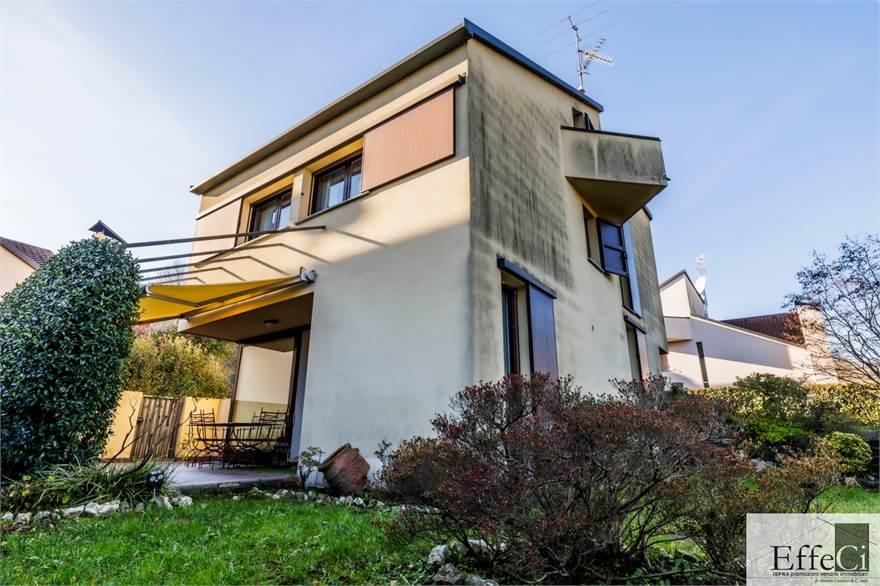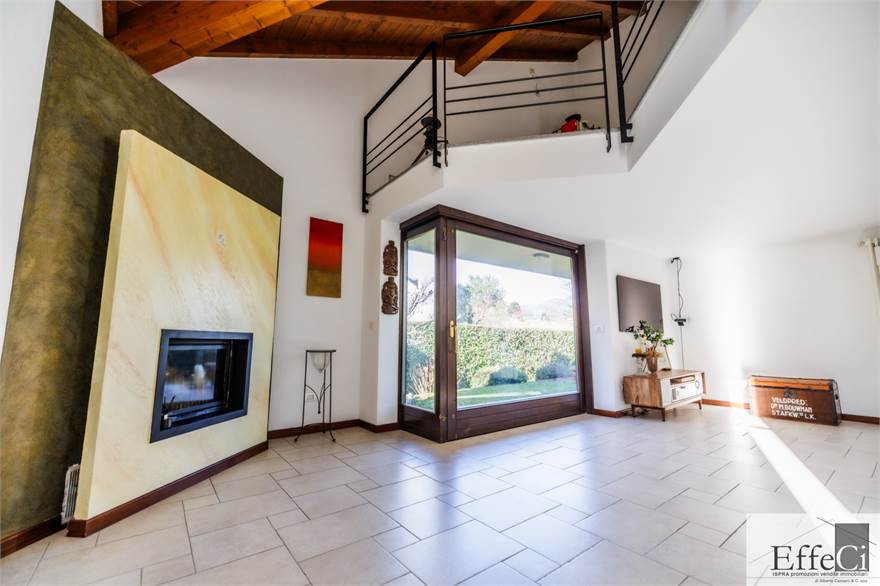 In zona verde e residenziale, vicino ai principali servizi, particolare e moderna villa indipendente con giardino privato, inserita in piccolo contesto immobiliare, disposta su piani ammezzati e composta da ingresso, sala da pranzo con accesso al patio, cucina, salotto con travi a vista, camino e portico, due camere matrimoniali di cui una con cabina armadio, soppalco utilizzabile come studio/camera, ampia camera con travi a vista, wc e due balconi. Al piano seminterrato taverna con cucina a vista, bagno, locale caldaia/lavanderia ed accesso diretto all'autorimessa. L'immobile nella sua tipicità si trova in buone condizioni con serramenti in legno con vetrocamera doppia, rivestimenti in ceramica, impianto di allarme e teda sole automatizzata. Il giardino è ben piantumato e godibile. Area verde comune adibita a parcheggio.