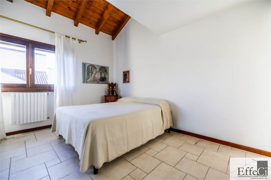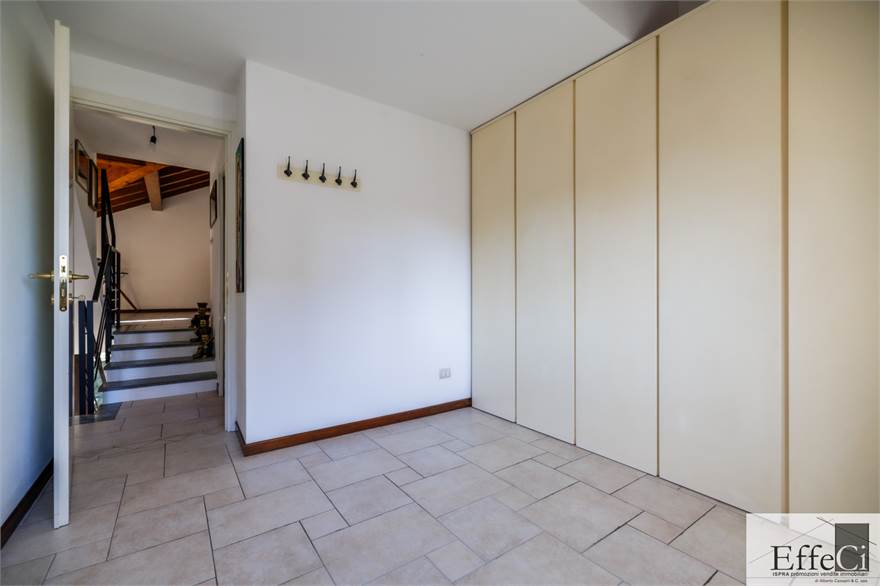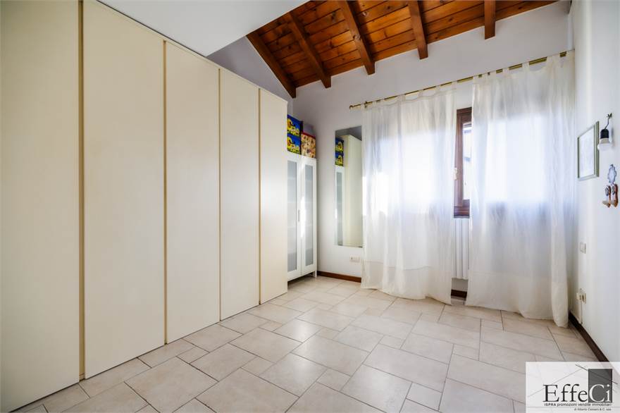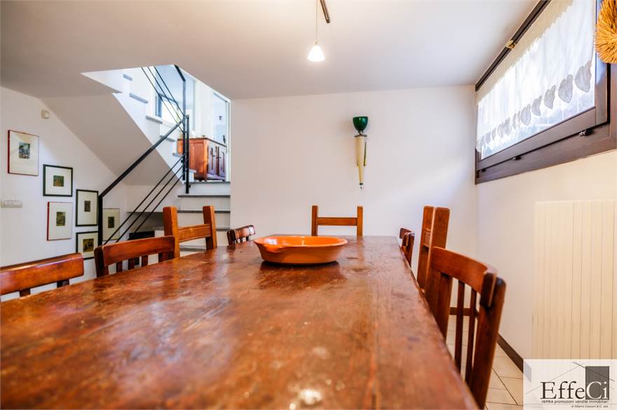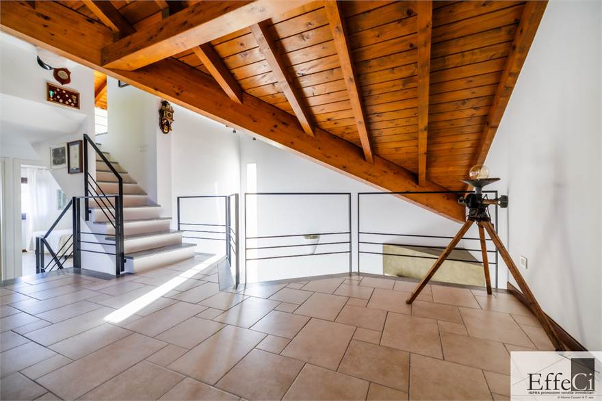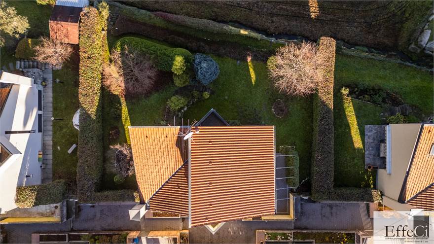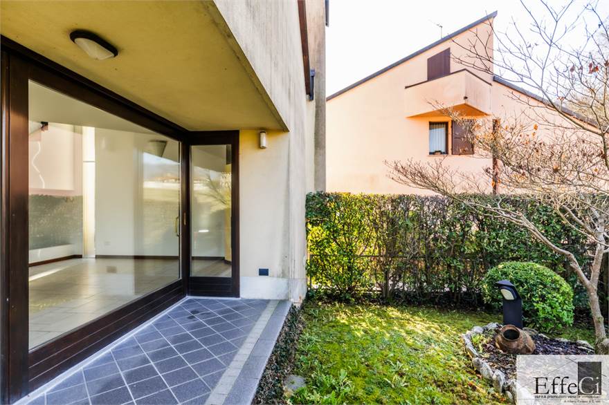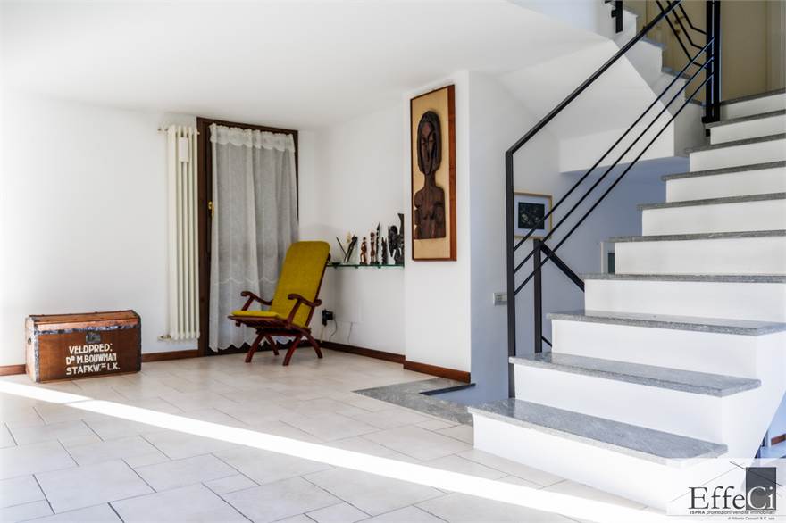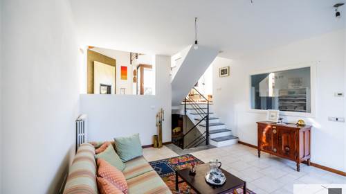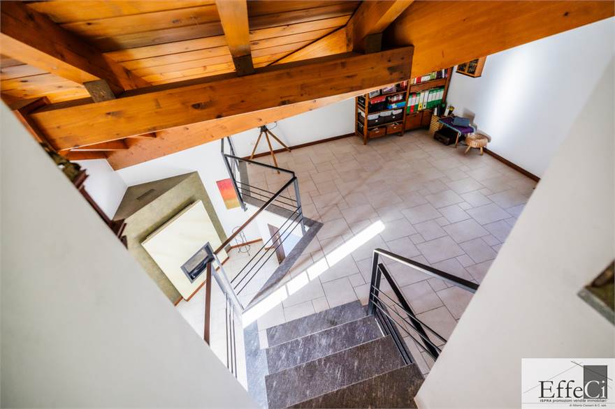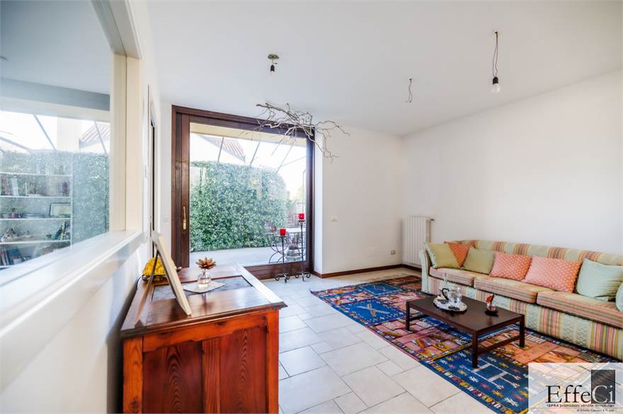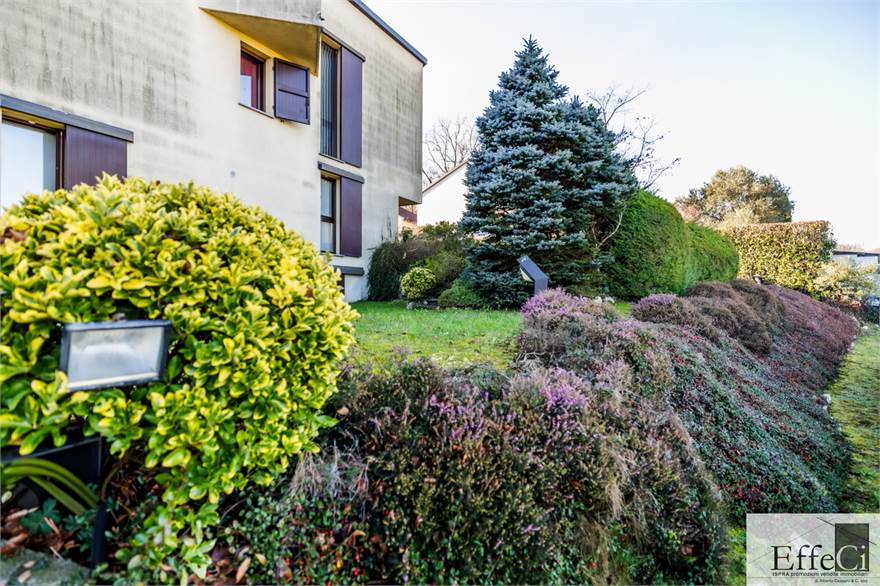 In zona verde e residenziale, vicino ai principali servizi, particolare e moderna villa indipendente con giardino privato, inserita in piccolo contesto immobiliare, disposta su piani ammezzati e composta da ingresso, sala da pranzo con accesso al patio, cucina, salotto con travi a vista, camino e portico, due camere matrimoniali di cui una con cabina armadio, soppalco utilizzabile come studio/camera, ampia camera con travi a vista, wc e due balconi. Al piano seminterrato taverna con cucina a vista, bagno, locale caldaia/lavanderia ed accesso diretto all'autorimessa. L'immobile nella sua tipicità si trova in buone condizioni con serramenti in legno con vetrocamera doppia, rivestimenti in ceramica, impianto di allarme e teda sole automatizzata. Il giardino è ben piantumato e godibile. Area verde comune adibita a parcheggio.