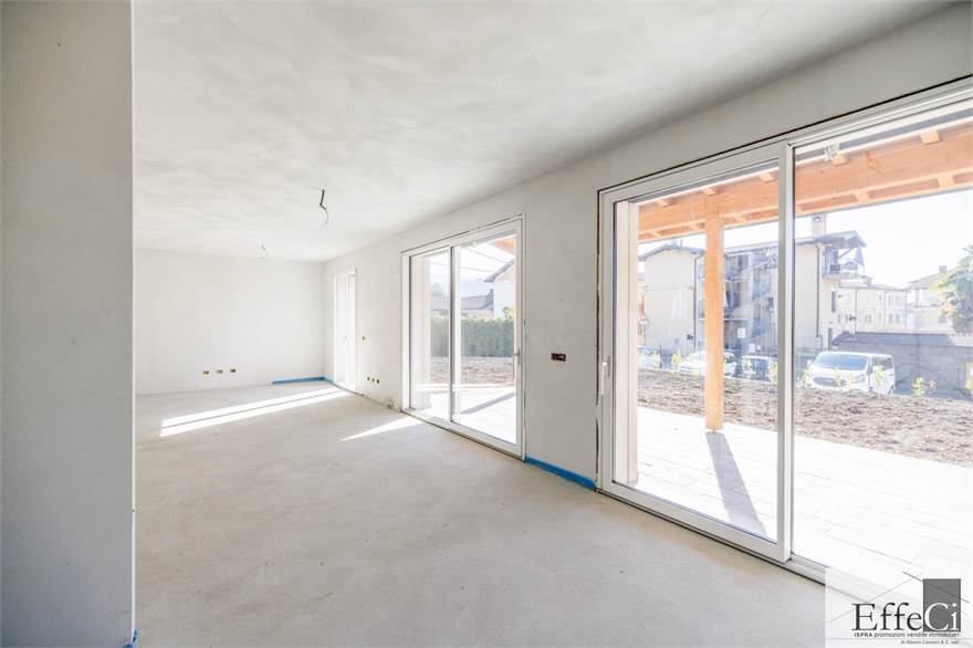 Le abitazioni si sviluppano su due livelli e sono circondate da area verde privata, perfetta per momenti di relax all’aperto, cene estive sotto il portico o per far giocare i bambini in totale sicurezza. Al piano terra troviamo un ampio e luminoso soggiorno con cucina open-space, valorizzato da tre grandi porte finestre che affacciano direttamente sul portico e sul giardino, creando una splendida continuità tra interno ed esterno. Completano il piano un antibagno, un bagno di servizio dove è possibile ricavare una comoda lavanderia .