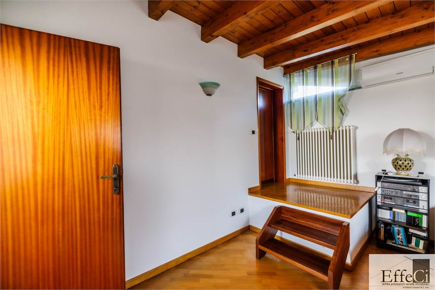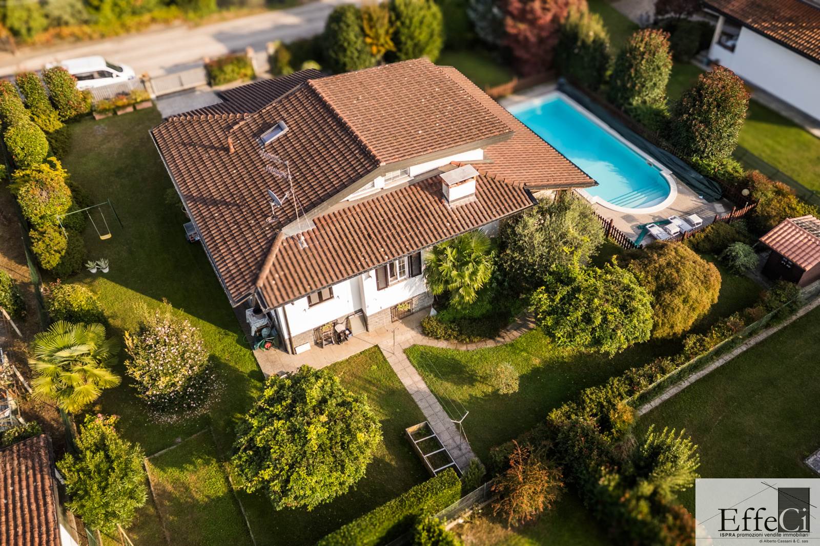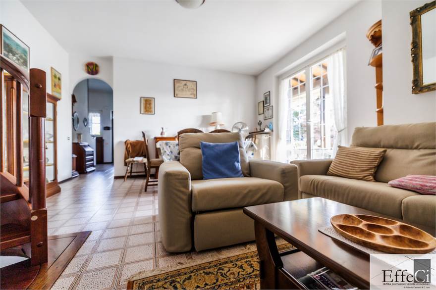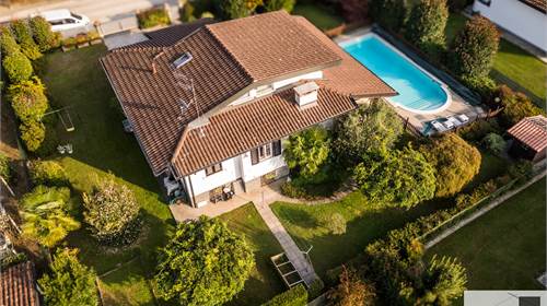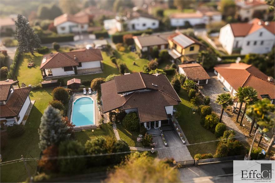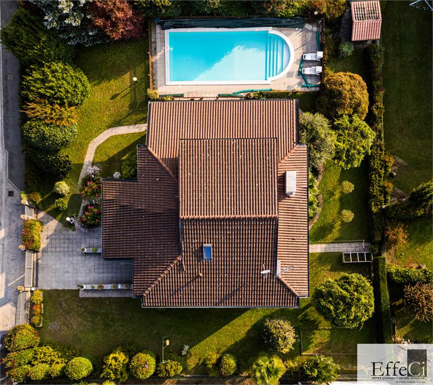 In zona verde e non distante dai servizi e dal lago, ampia villa indipendente con giardino ben piantumato e piscina e disposta su tre livelli. Al piano terra ingresso, soggiorno con camino e portico, cucina abitabile, disimpegno con armadi a muro, tre camere e doppi servizi. al piano primo mansardato con travi a vista, spaziosa camera con bagno privato e cabina armadio. al piano interrato, autorimessa, locale lavanderia, locale caldaia e cantina. L'immobile si trova in buone condizioni con serramenti in alluminio con vetrocamera doppia, rivestimenti in ceramica nella zona giorno ed in parquet nella zona notte. Il piano primo è stato rivisto con la sostituzione e la coibentazione del tetto, la sostituzione degli impianti e dell'installazione della climatizzazione. Ottima esposizione. Il giardino è pianeggiante e ben usufruibile..